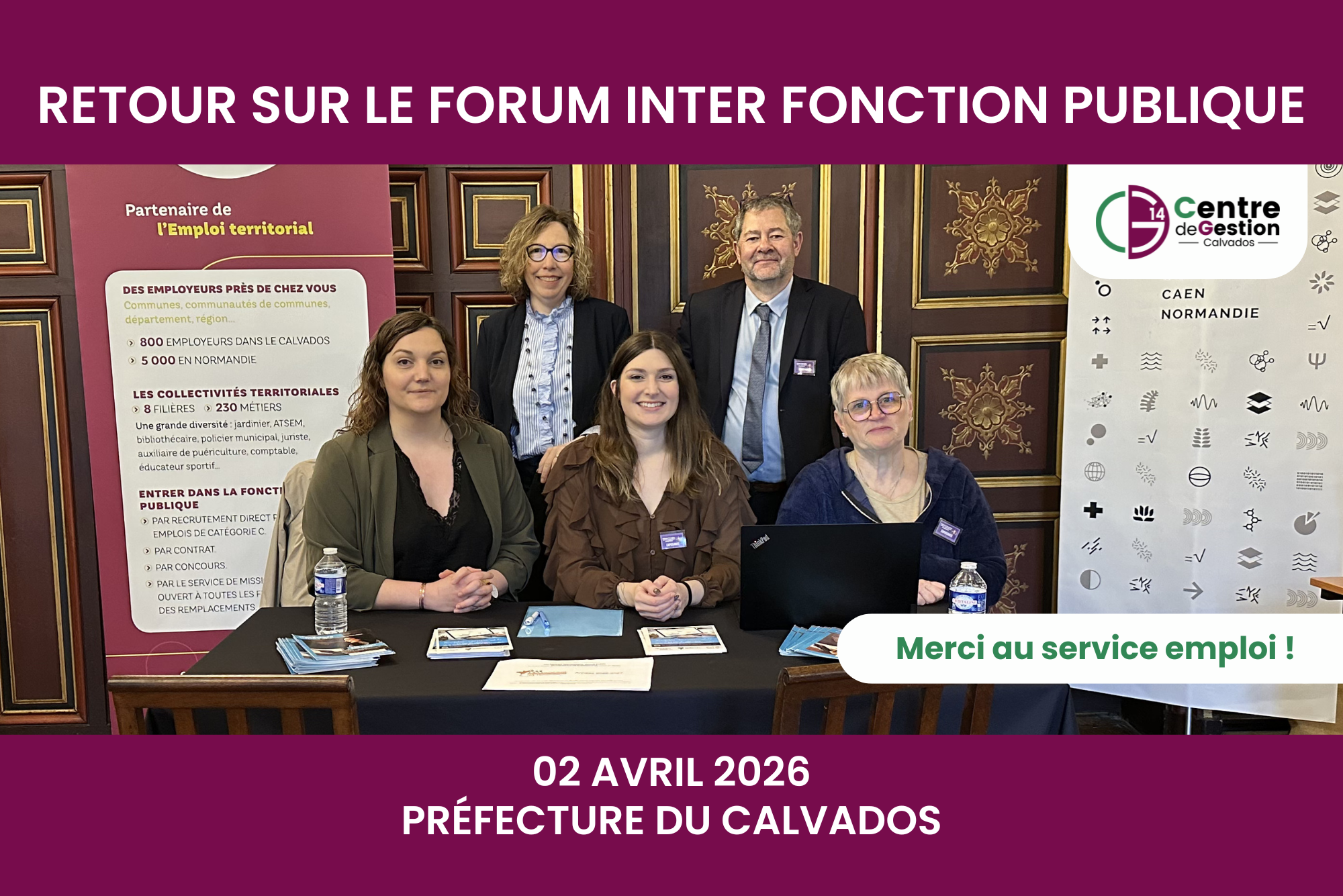 Le jeudi 2 avril 2026, le service Emploi et Attractivité CDG14 a participé au Forum Mobilité Inter‑Fonction Publique organisé dans les salons de la Préfecture du Calvados. Plus de 270 agents issus des trois versants de la fonction publique ont profité de cette journée pour rencontrer les employeurs et échanger autour de leurs projets de mobilité.
